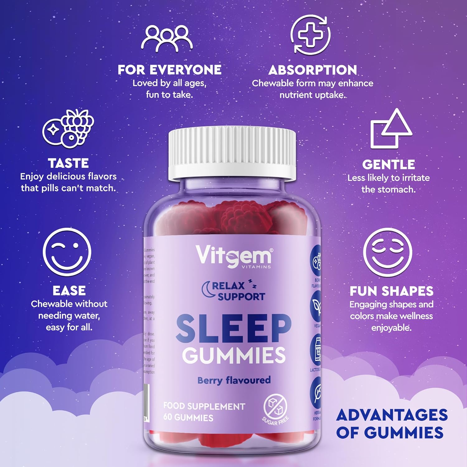 Experience the ultimate in restful sleep with Vitgem Sleep Gummies – your nightly companion for relaxation and rejuvenation. Bursting with irresistible berry flavor, these sugar-free gummies are expertly crafted to support improved sleep quality and help you unwind before bedtime. Each convenient bottle contains 60 easy-to-chew gummies, making it simple to add this tasty food supplement to your evening routine. The gummies feature a vibrant purple color, adding a touch of delight to your wellness regimen. Perfect for home or travel, Vitgem Sleep Gummies are your delicious solution for a peaceful, restorative night’s sleep.